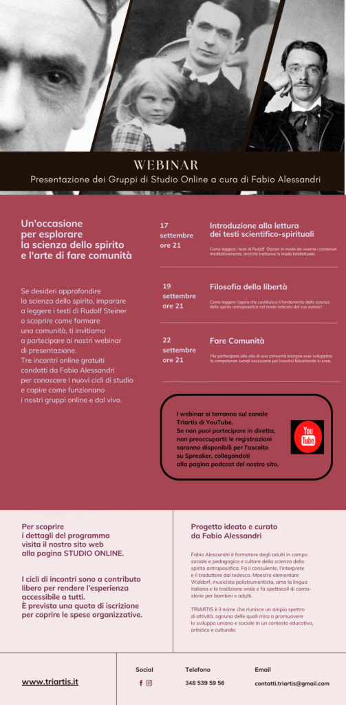 A partire da settembre riprenderanno gli incontri online condotti da Fabio Alessandri. Alcuni di essi sono pensati per aiutare chi desidera approfondire la scienza dello spirito antroposofica, affrontando le difficoltà di lettura e studio dei testi e collegando quanto appreso alla propria esperienza di vita. Quest’anno avvieremo un nuovo ciclo intitolato “Introduzione alla lettura dei testi scientifico-spirituali”, volto a dare indicazioni di carattere generale per la lettura di testi di Rudolf Steiner, indipendentemente dal libro scelto. Inoltre inizieranno degli incontri dedicati alla formazione di comunità (vedi descrizione più avanti).